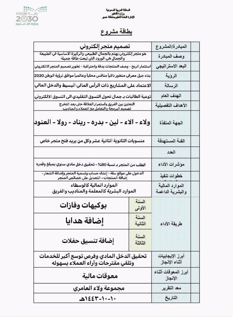 الطالبات المنفذات للمشروع : ولاء – وتين – لين – بدرة – ريناد – رولا – العنود .